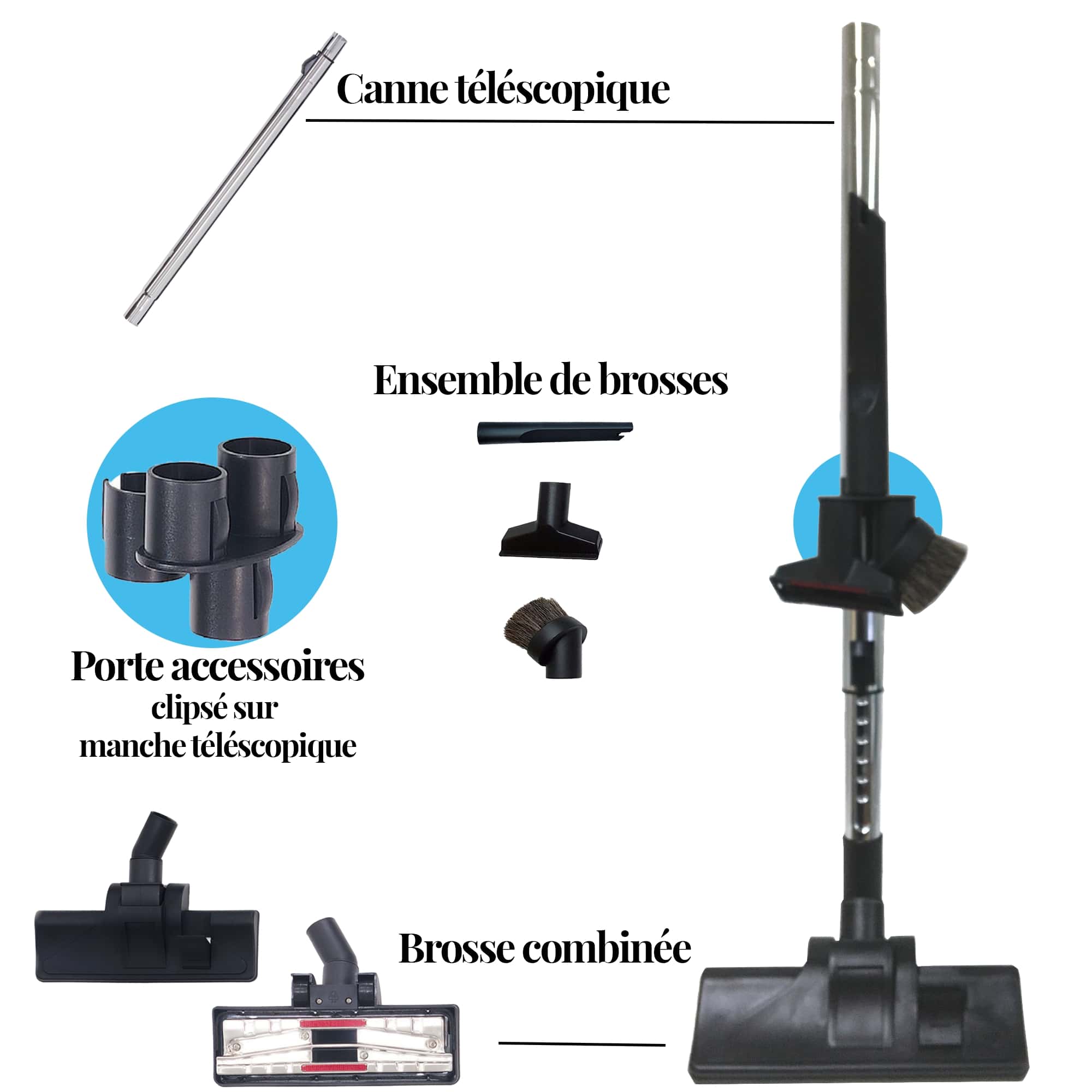 1 porte accessoire sur manche télescopique pour suceur plat et rectangle ainsi que la brosse à épousseter, vos brosses d'aspiration seront toujours avec vous lorsque vous passez l'aspirateur.